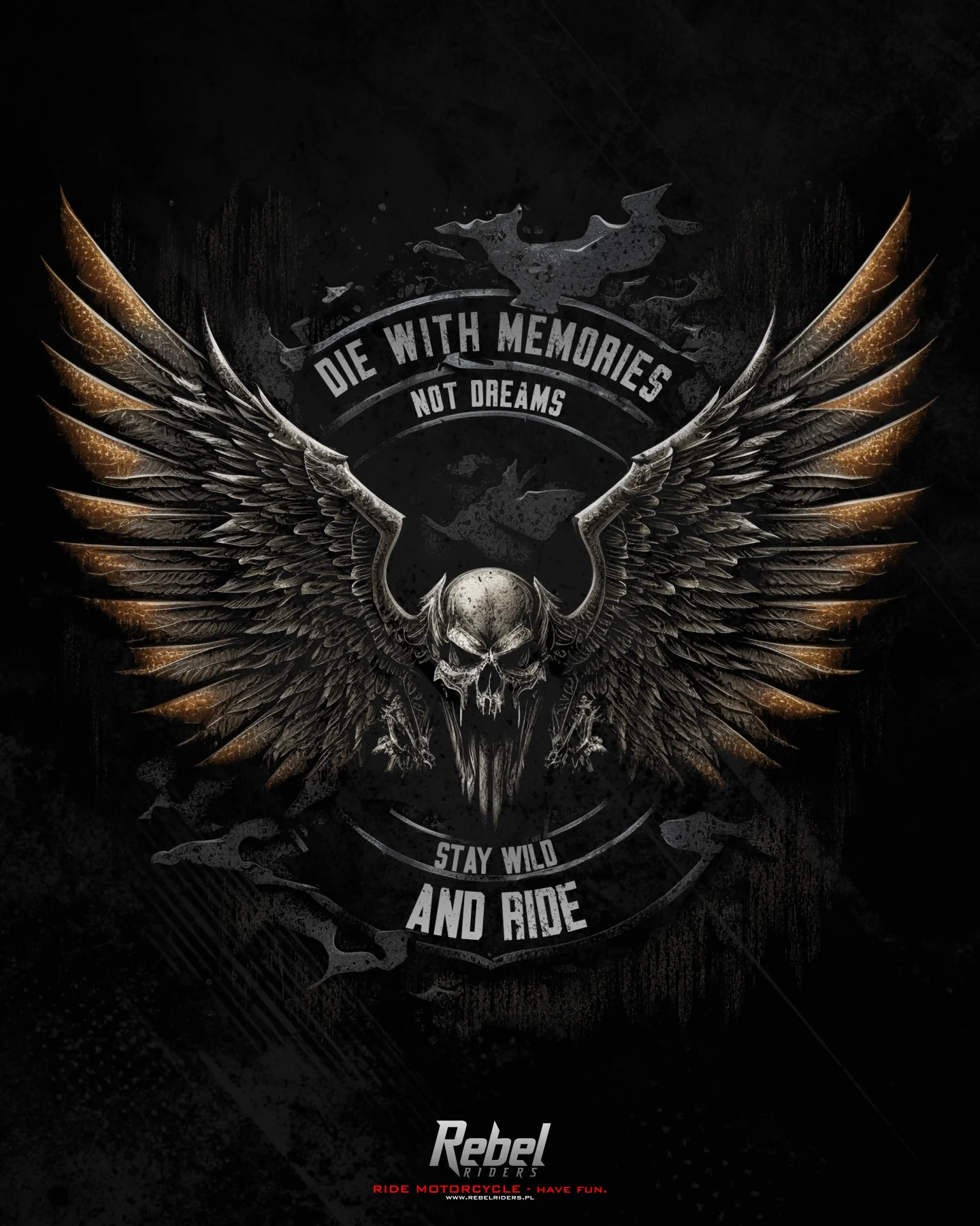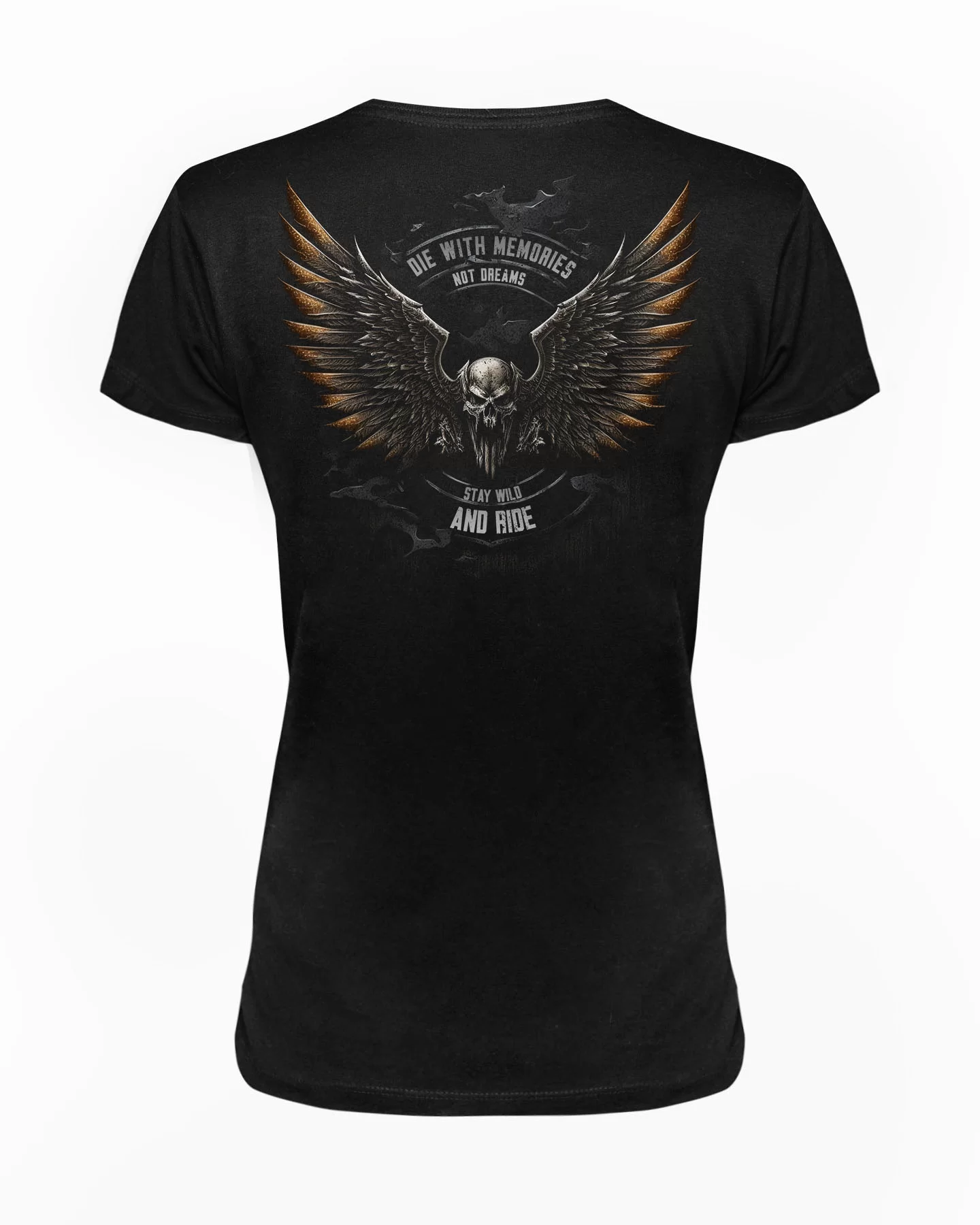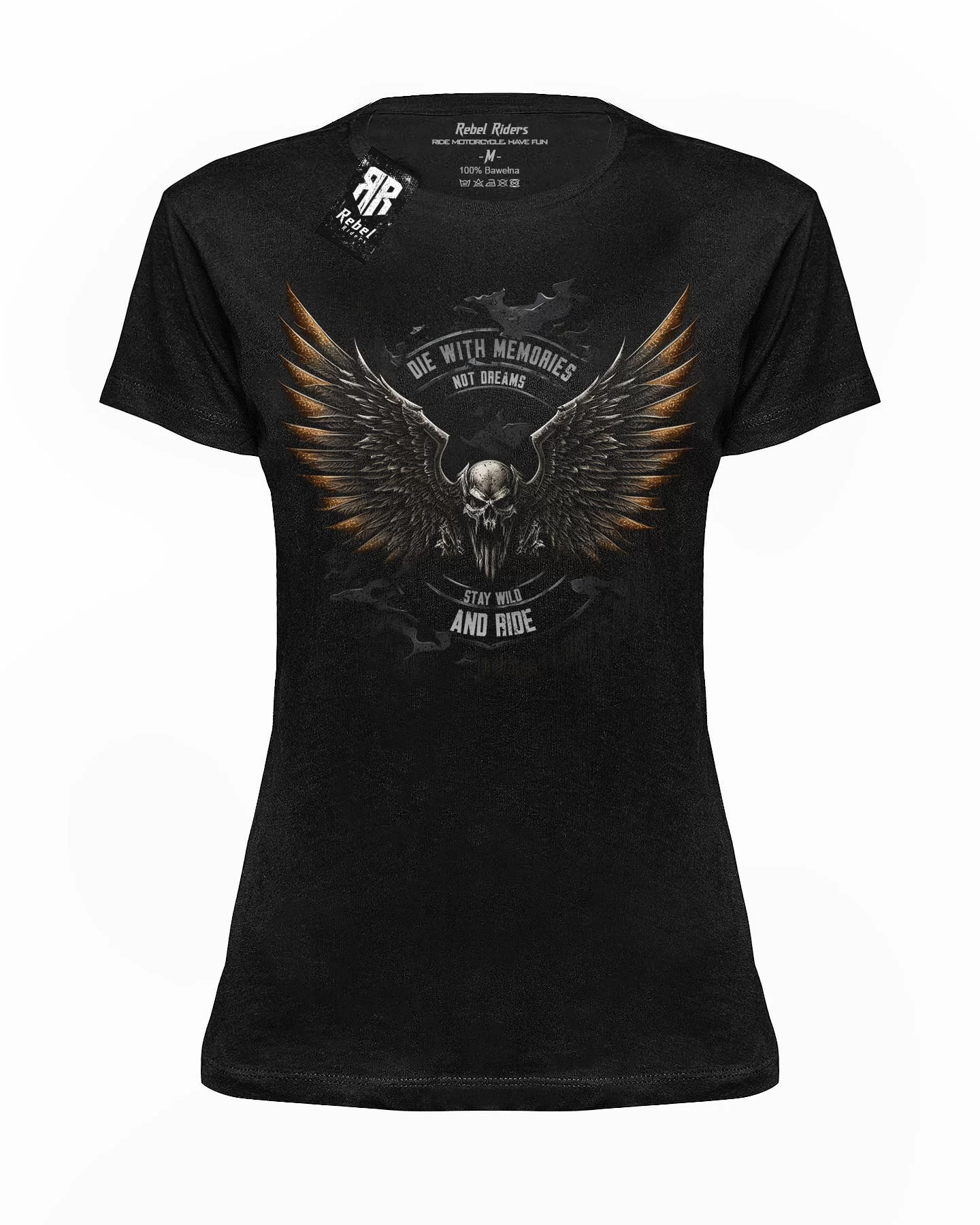 T-shirt damski czarny 'Stay Wild and Ride' - dla tych, co wolą wspomnienia niż marzenia. Ten czarny t-shirt nie przebiera w słowach ani w stylu. Z przodu koszulki króluje drapieżny design: czaszka z rozpostartymi skrzydłami, otoczona mottem 'Die with memories, not dreams. Stay wild and ride'. Stworzony dla odważnych, którzy życie traktują jak niekończącą się jazdę - pełną przygód, wolności i niezapomnianych chwil. Niech ten t-shirt będzie Twoim manifestem - przypomnieniem, że życie warto przeżywać na pełnych obrotach, z pasją i bez ograniczeń. Idealny dla tych, którzy cenią sobie oryginalność i chcą wyrazić siebie przez niebanalny, zadziorny styl. Odważ się być dziką i niezależną. Czas na przygodę!