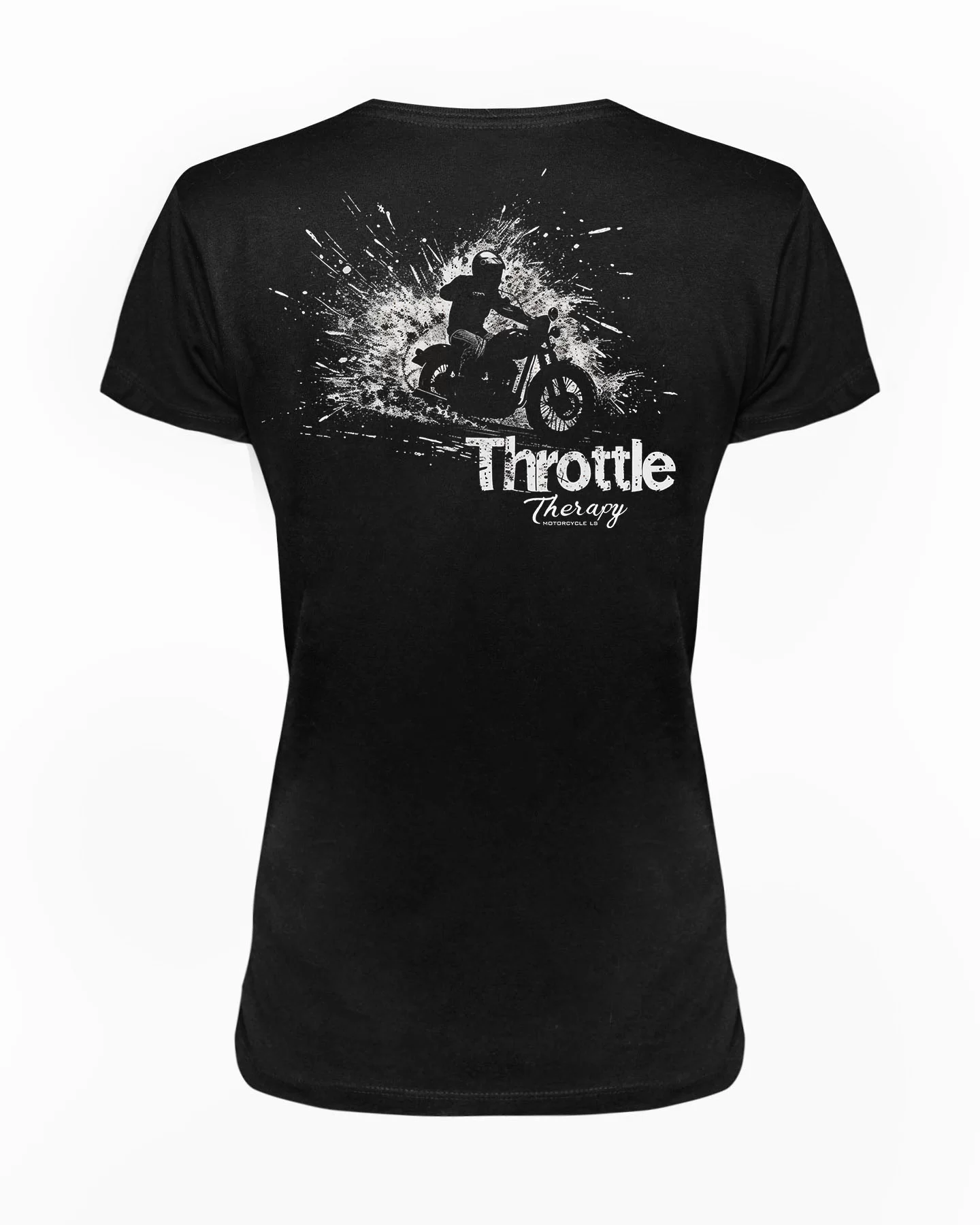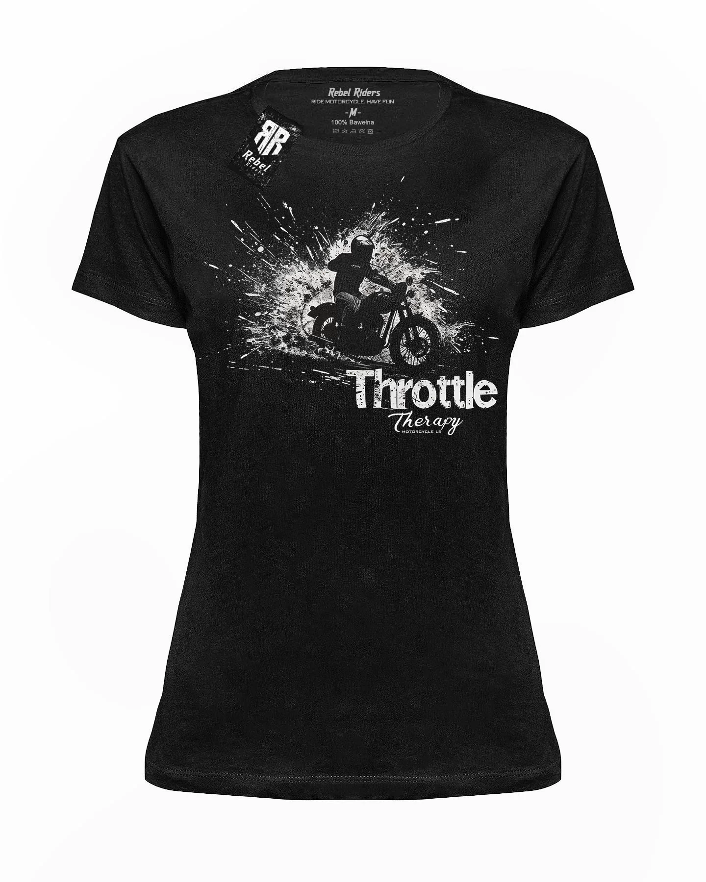 T-shirt Therapy to modny i wygodny damski t-shirt w kolorze czarnym. Wykonany z wysokiej jakości materiałów, idealnie dopasowuje się do sylwetki. T-shirt ten doskonale sprawdzi się na co dzień, zarówno w zestawieniu z jeansami, jak i elegancką spódnicą. Projekt z motywem motocyklisty na motocyklu Therapy marki Rebel Riders, znanej z nietuzinkowych wzorów i wysokiej jakości wykonania. Oryginalny, designerski element garderoby, który nie może zabraknąć w szafie każdej trendy kobiety. Zdecyduj się na T-shirt Therapy i poczuj się wyjątkowo każdego dnia!