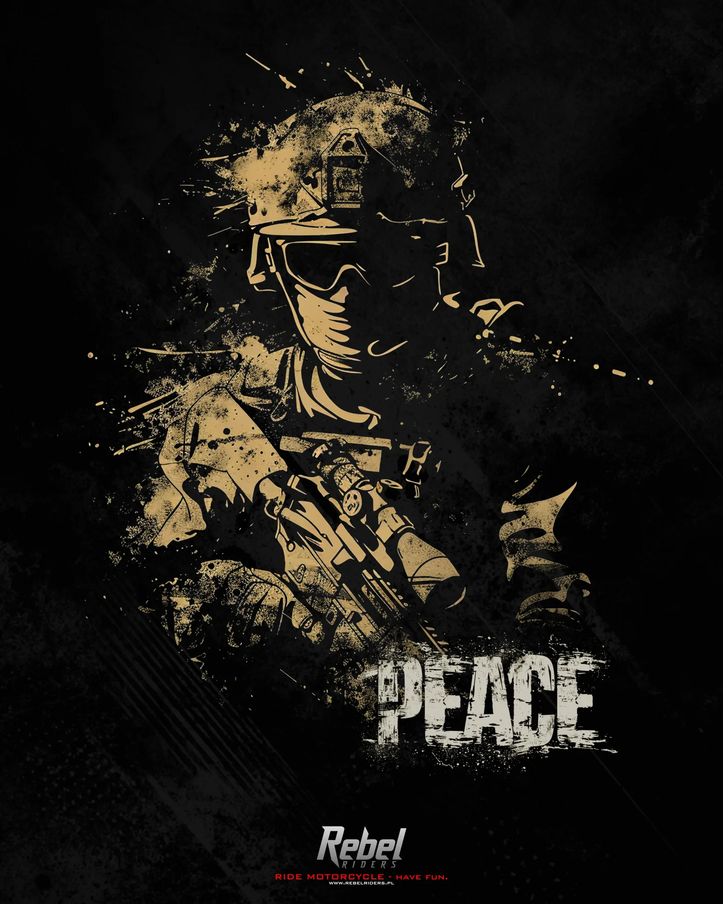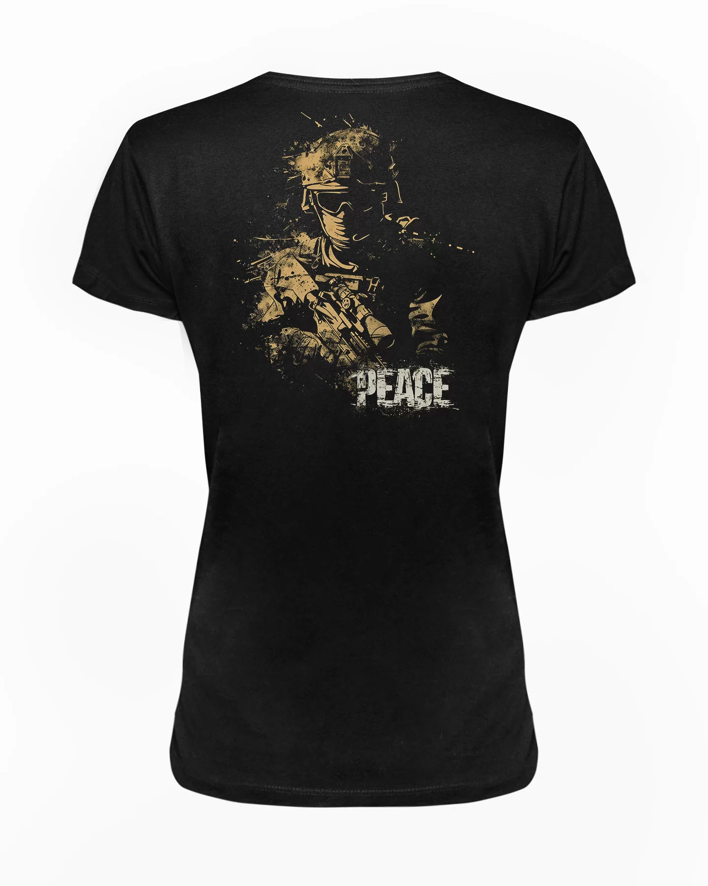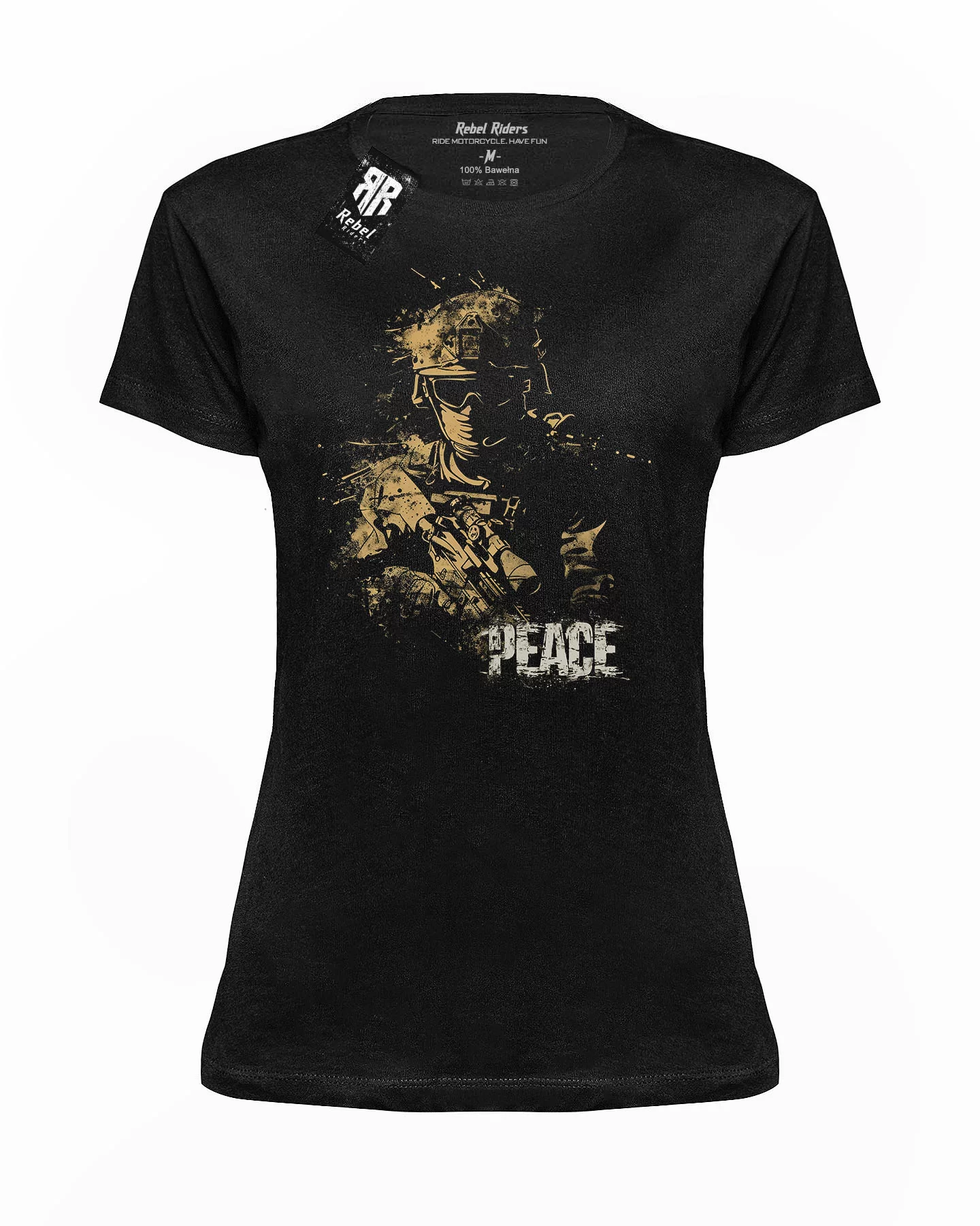 Zachwycający t-shirt damski w kolorze czarnym z motywem żołnierza oraz napisem pokoju "Peace". Wyjątkowy design, wygodny fason i wysoka jakość wykonania sprawiają, że ten model z pewnością przypadnie do gustu wszystkim kobietom kochającym świat mody i oryginalnych wzorów. Idealny wybór dla indywidualistek, które chcą wyrazić swoje poglądy i wartości poprzez swój ubiór. Niezwykle modny i uniwersalny element garderoby, który doskonale sprawdzi się w wielu stylizacjach. Nie przegap okazji i zamów już teraz!