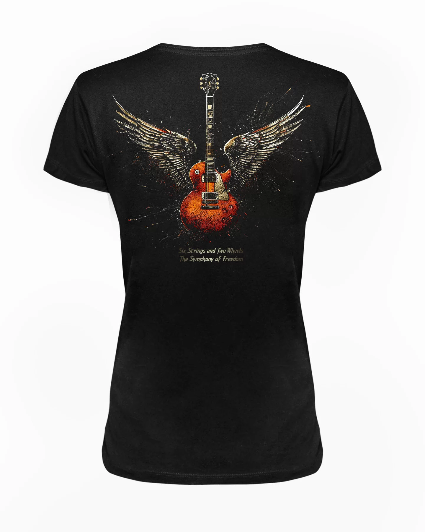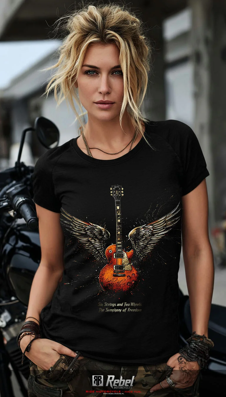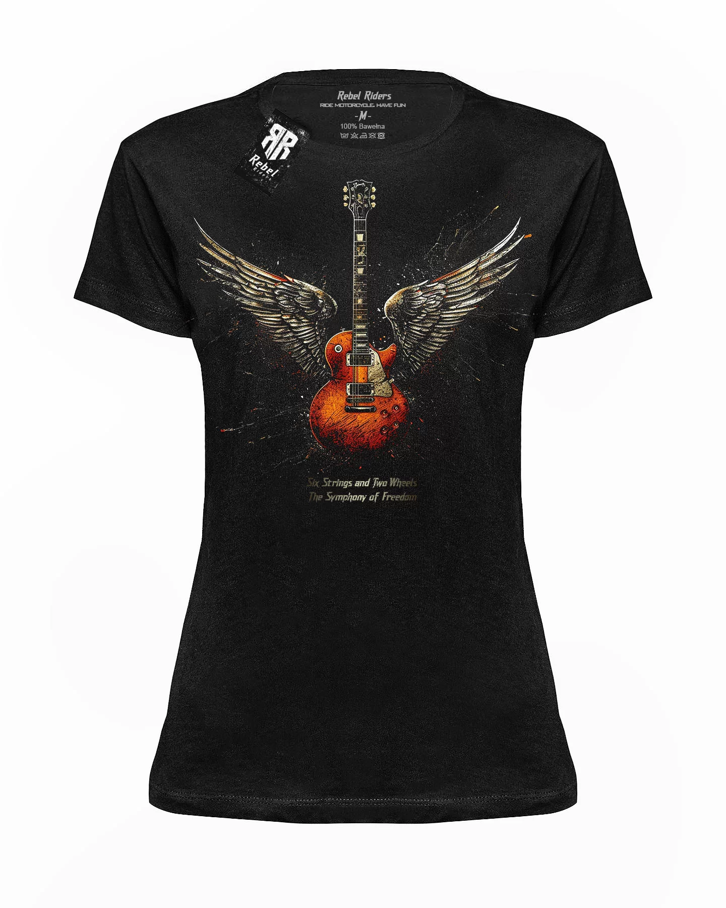 Odkryj nutę wolności z naszym wyjątkowym, damskim czarnym t-shirtem, który zdobi motyw gitary i napis "Six Strings and Two Wheels - The Symphony of Freedom". Ten t-shirt jest stworzony dla dusz, które swoją wolność odnajdują zarówno w wirze motocyklowych przygód, jak i w głębi muzycznych riffów. Idealny dla pań, które żyją na pełnej petardzie, to manifest wolności, pasji i niezależności.
