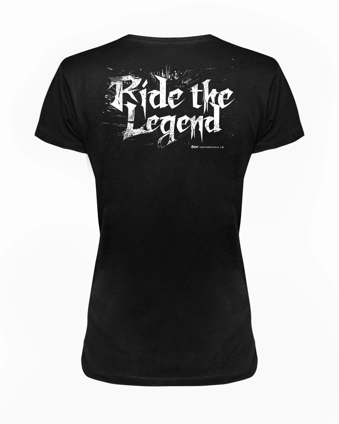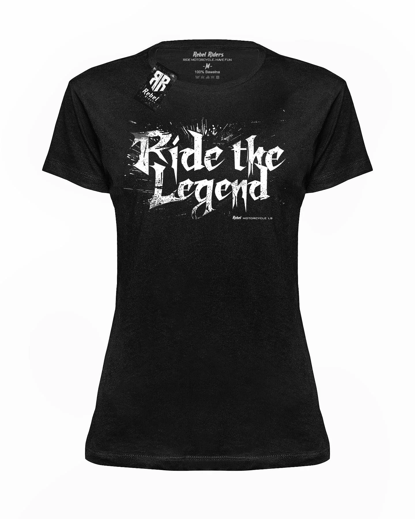 Elegancki t-shirt damski w kolorze czarnym. Idealny na każdą okazję. Wykonany z wysokiej jakości materiałów, które gwarantują komfort noszenia. Posiada unikalny design w postaci białego napisu "Ride the Legend", który przyciąga uwagę. Doskonały wybór dla rebeliantek, które lubią wyrażać swoją indywidualność poprzez modę. rebelriders.pl - miejsce dla kobiet z charakterem. Skorzystaj z naszej oferty i poczuj się wyjątkowo!