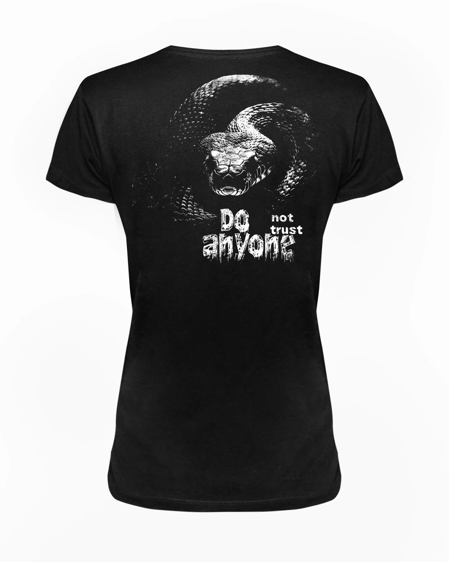 Snake T-shirt damski w kolorze czarnym jest idealnym wyborem dla kobiet o mocnym charakterze i indywidualnym stylu. Wykonany z wysokiej jakości materiałów, zapewnia wygodę i komfort noszenia. Grafika przedstawiająca węża oraz napis "Do not trust anyone" dodaje odważności i oryginalności. Doskonały element garderoby dla rebeliantek i miłośniczek streetwearu. Dzięki uniwersalnemu kolorowi można świetnie zestawić go z różnymi stylizacjami.