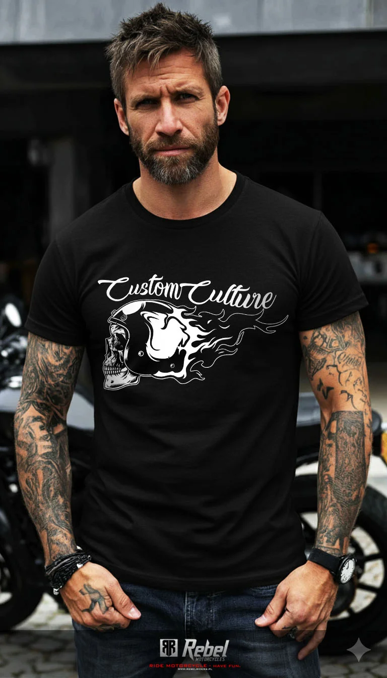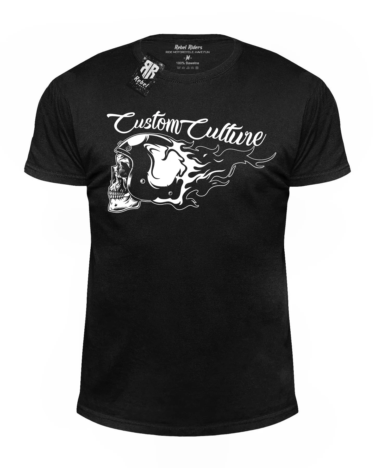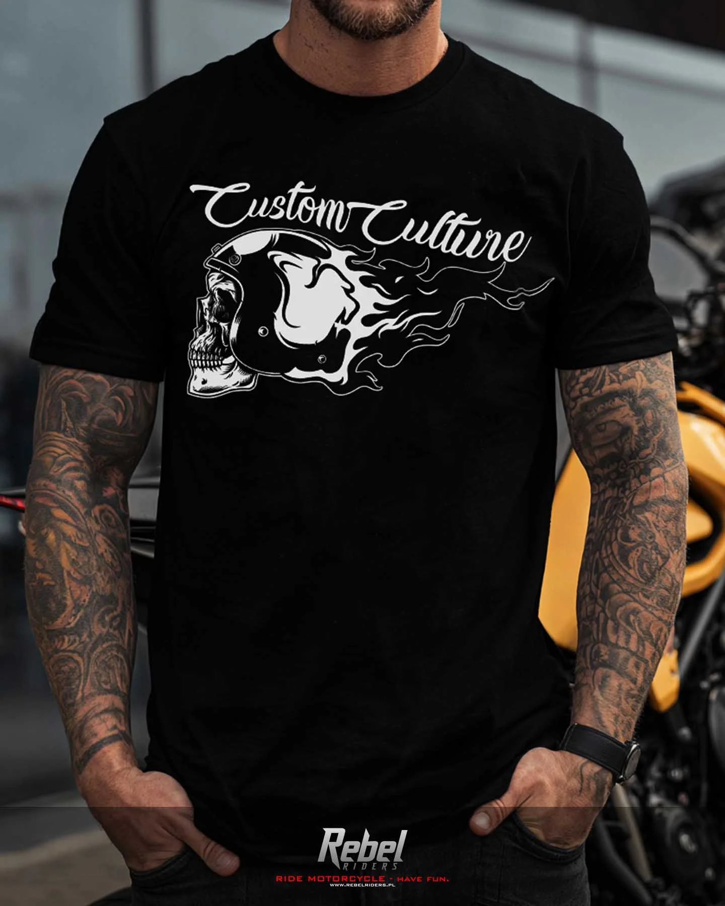 CustomCulture T-shirt męski czarny z motywem czachy w płonącym kasku to propozycja dla mężczyzn ceniących motocyklowy oraz streetwearowy styl. Ten czarny t-shirt idealnie wpisuje się w modę miejską i charakteryzuje się wysoką jakością wykonania. Wygodny i stylowy, doskonale sprawdzi się jako element codziennej garderoby. Idealny dla rebeliantów, którzy chcą podkreślić swój indywidualny charakter.