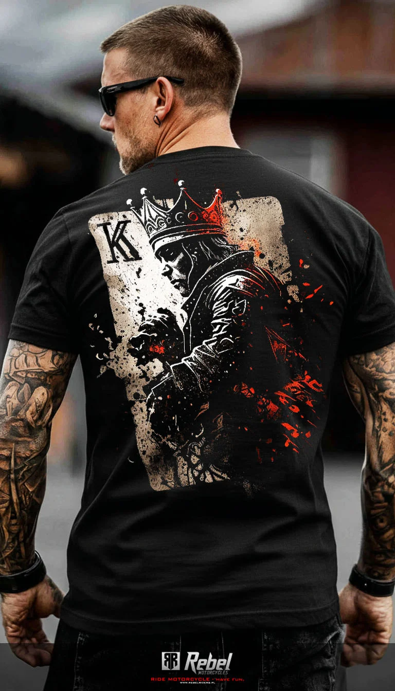 Kingcard t-shirt męski to idealna propozycja dla wszystkich miłośników stylu streetwear. Wykonany z wysokiej jakości materiałów, gwarantuje komfort noszenia oraz trwałość. Czarny kolor sprawia, że koszulka jest uniwersalna i łatwo dopasuje się do wielu stylizacji. Na przodzie koszulki znajduje się wyjątkowy motyw króla i karty, który dodaje jej charakteru. To doskonała propozycja dla osób, które chcą wyrazić swoją indywidualność poprzez modę. Idealna na co dzień oraz na wyjątkowe okazje. Must-have w szafie każdego fashionisty!