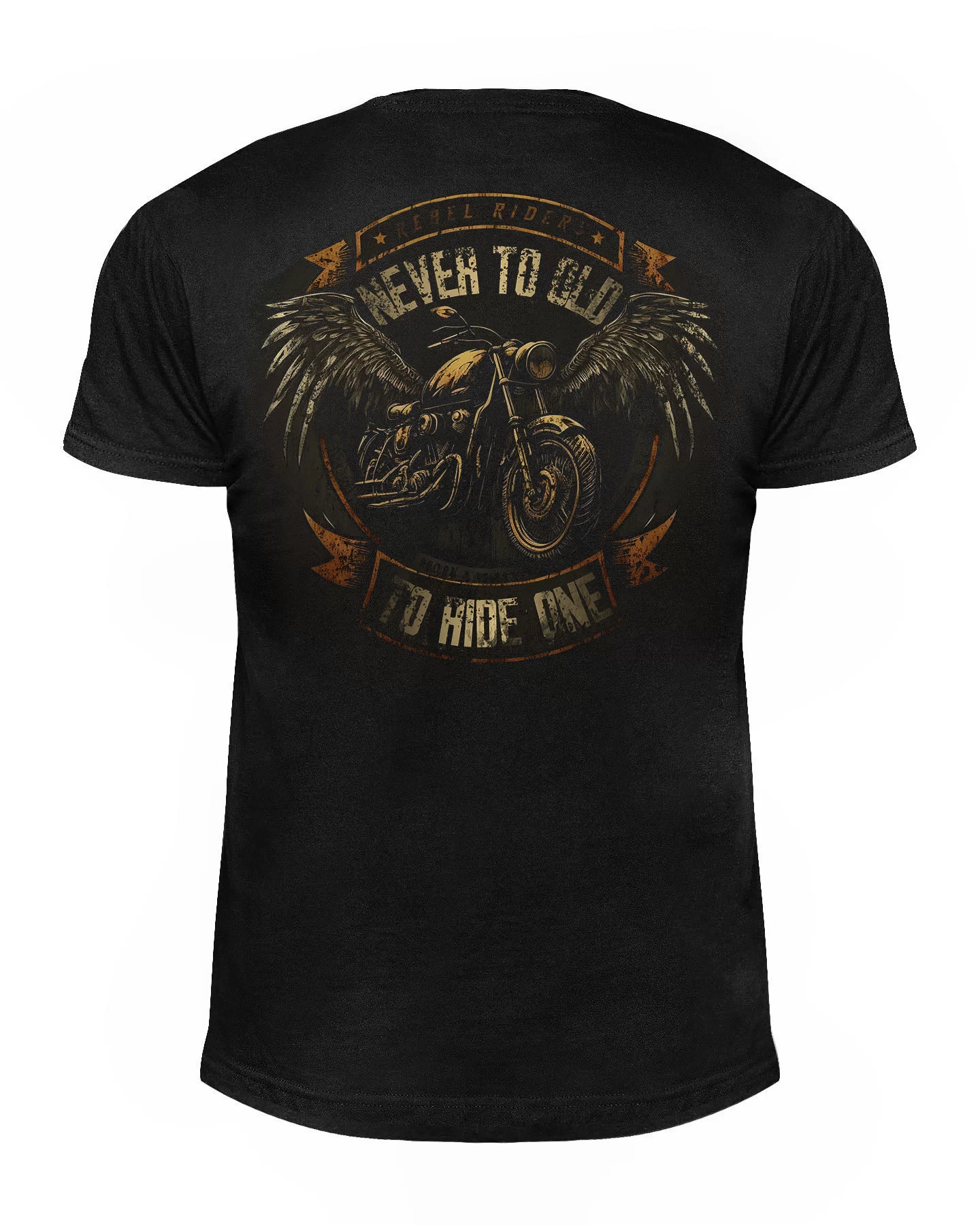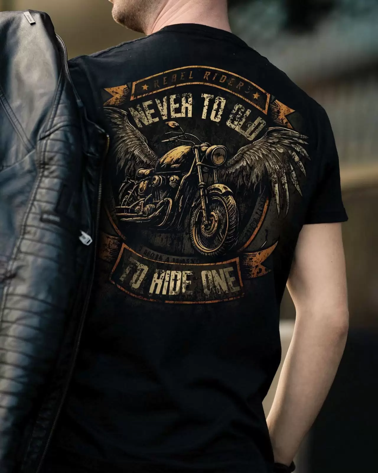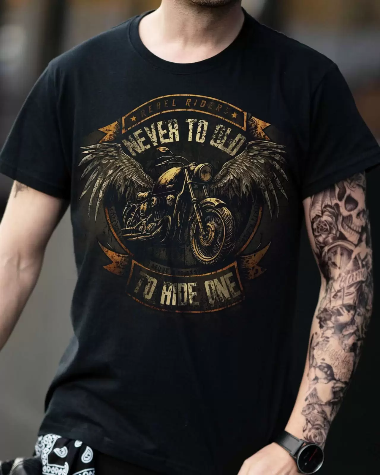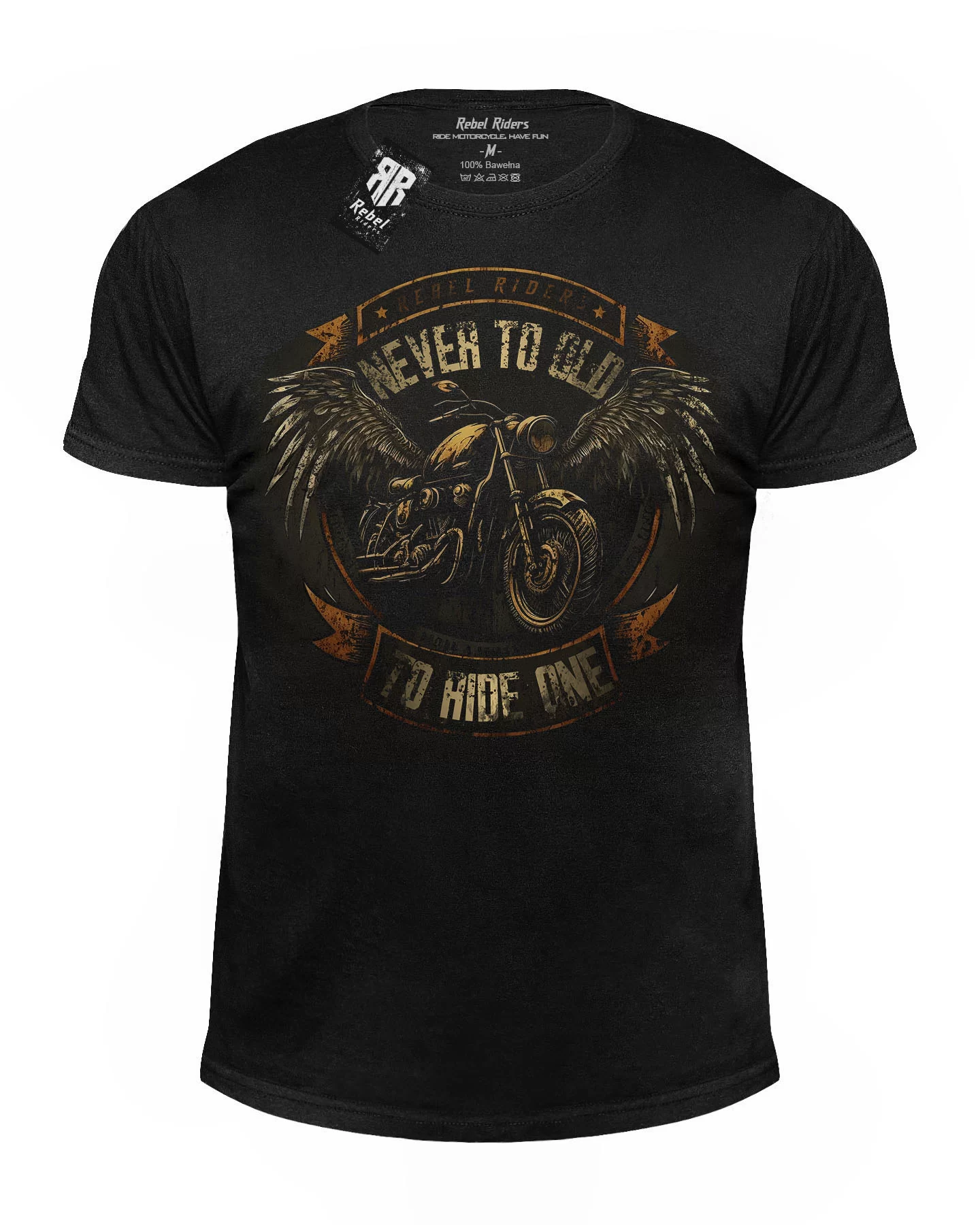 NeverTooOld T-shirt męski w kolorze czarnym to idealna propozycja dla mężczyzn, którzy nigdy nie przestają być młodzi duchem. Wykonany z wysokiej jakości materiałów, ten koszulka zapewnia maksymalny komfort noszenia i doskonałe dopasowanie do sylwetki. Na koszulce znajduje się motyw motocykle ze skrzydłami w odcieniach koloru pomarańczowego. Charakterystyczny napis "NeverTooOld" nadaje jej wyjątkowego charakteru i sprawia, że wyróżnisz się z tłumu. Produkt dedykowany dla osób ceniących sobie oryginalność i wyrazisty styl. Doskonały wybór zarówno na co dzień, jak i na wyjątkowe okazje. Wyraź swoją niezależność i młodzieńczy zapał, wybierając T-shirt NeverTooOld.