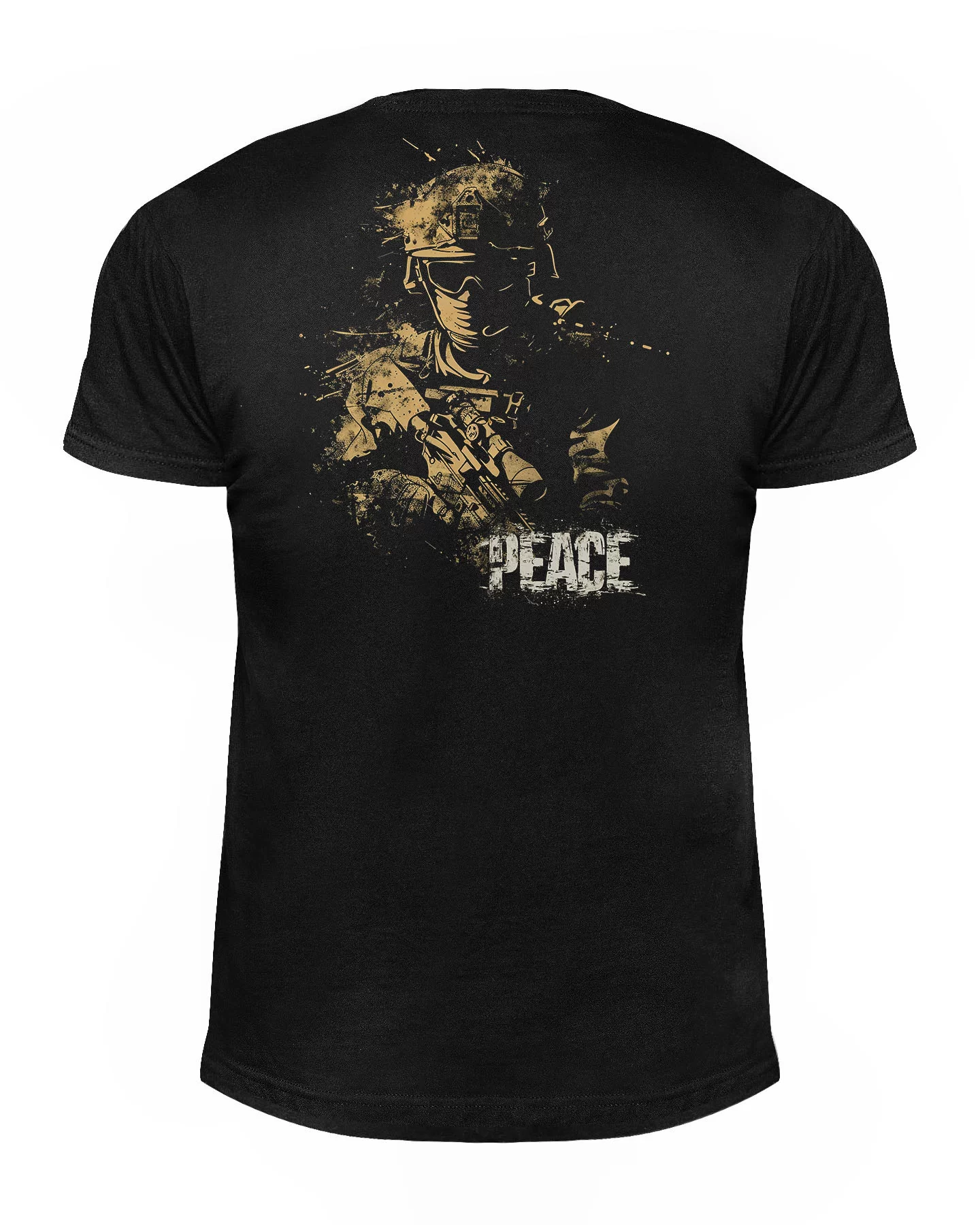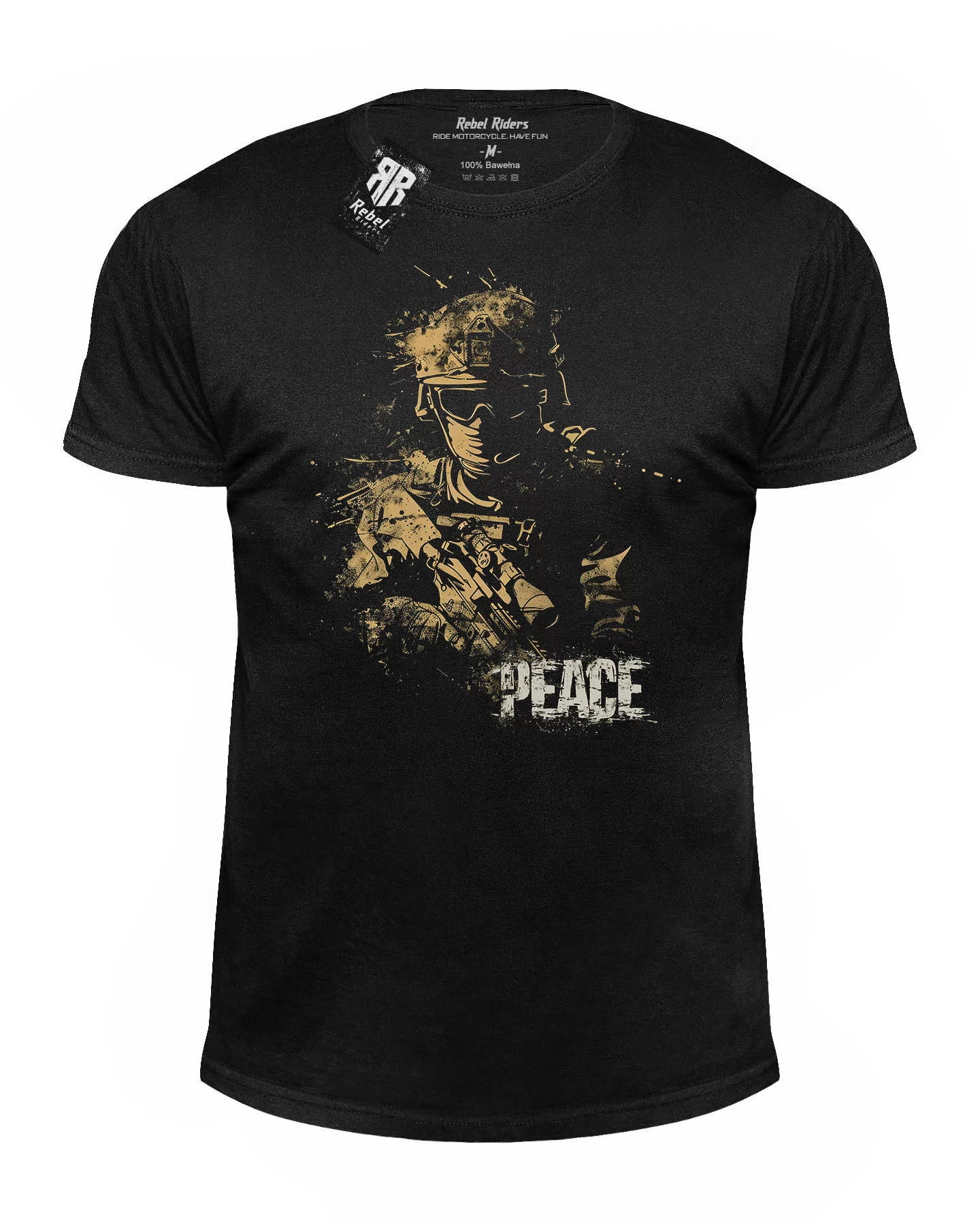 Wyjątkowy t-shirt męski w kolorze czarnym z motywem żołnierza oraz napisem "Peace" - Pokój . Idealny dla miłośników stylu rebel riders. Wysoka jakość wykonania i wygodny fason. Doskonały wybór dla osób ceniących wyraziste wzornictwo i swobodny styl. Znakomity element garderoby dla miłośników mody z przesłaniem. Świetny sposób na podkreślenie indywidualności i oryginalności. Kup teraz na stronie internetowej rebelriders.pl!