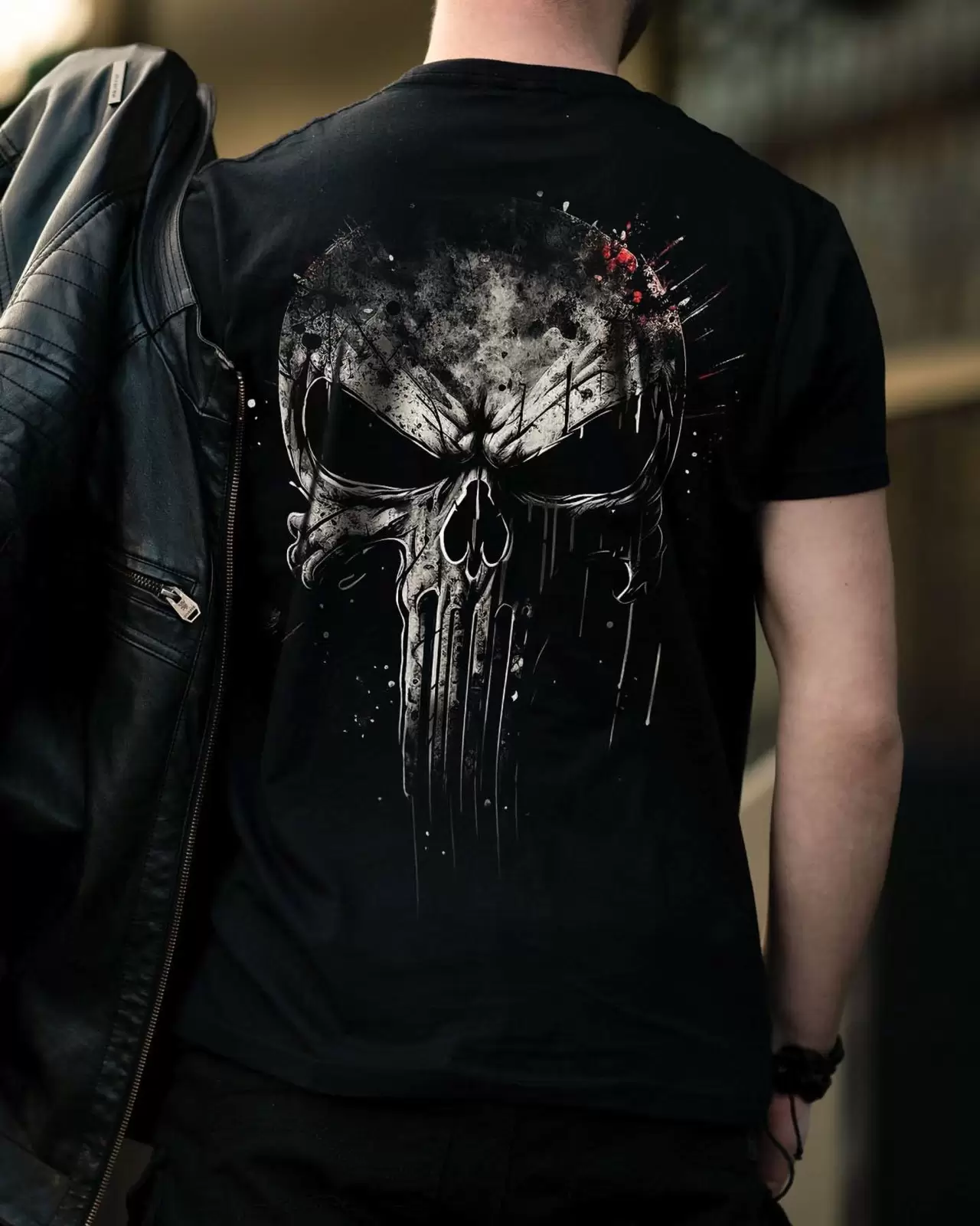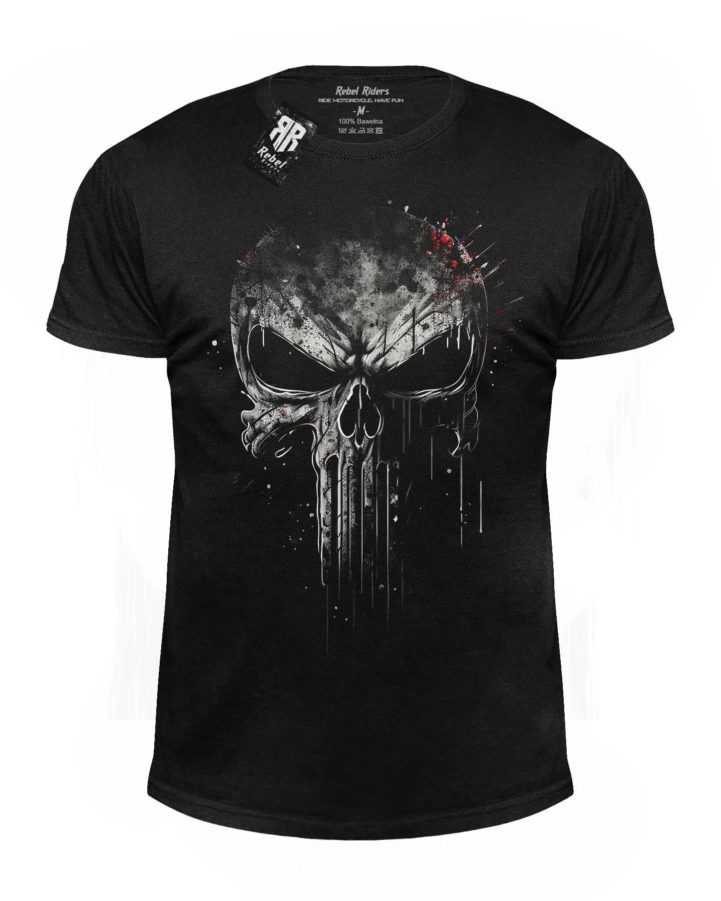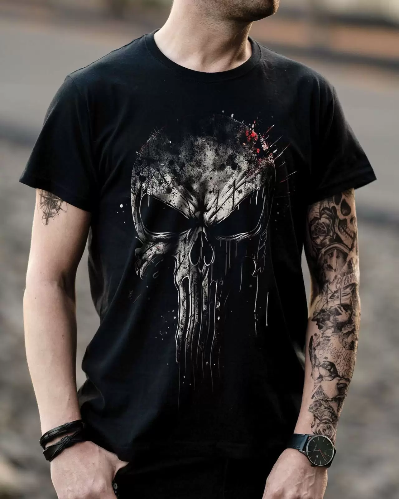 Czarny męski t-shirt z motywem Punishera to idealna propozycja dla miłośników kultowych komiksów i filmów akcji. Wykonany z wysokiej jakości materiału, jest nie tylko stylowy, ale także wygodny w noszeniu. Na przodzie koszulki znajduje się charakterystyczny emblemat antybohatera, co sprawia, że jest to idealny wybór dla osób lubiących odważne wzory. Dzięki uniwersalnemu krojowi oraz klasycznemu czarnemu kolorowi, t-shirt ten można zestawić zarówno z jeansami, jak i eleganckimi spodniami. Ten oryginalny i dynamiczny design na pewno przyciągnie spojrzenia i doda charakteru każdej stylizacji. Idealny wybór dla wszystkich fanów Punishera!